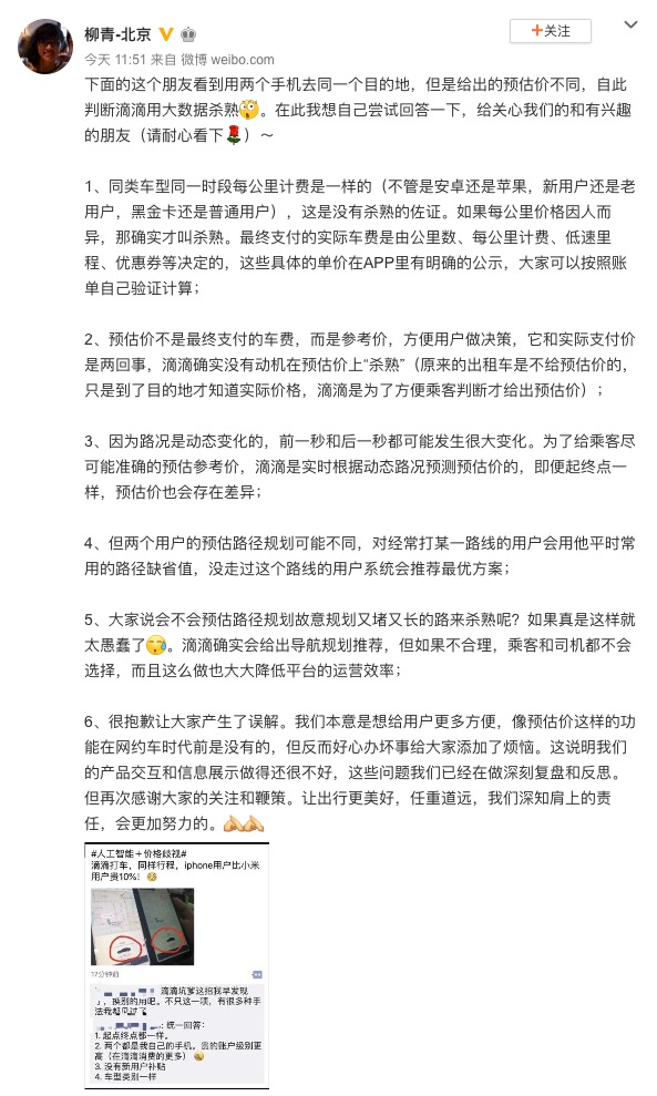 柳青还在微博中顺便一张用户质疑滴滴“人工智能+价格轻视”截图。图中用户表明,滴滴打车,相同行程,起点结尾相同,iPhone 用户比小米用户贵 10%。